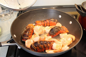 4. Remove the lobster and shrimp from skillet and set aside to cool. Once cool, peel the lobster tails and cut into bite sized pieces. Peel the shrimp, but leave whole.