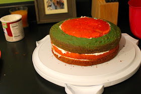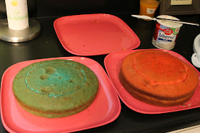 2. Divide the batter into three bowls evenly distributed. Color one red, one blue and leave the last one un-colored. Pour the batters into three 9" round cake pans (greased and floured). Bake according to directions.