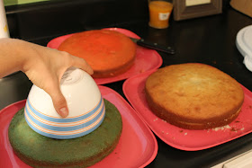 6. Now you're left with the whole blue cake and the thin top layers of the red and white cakes. Stack the thin red layer on top of the thin white layer. Using a bowl as your guide, cut a circle in the middle of both your blue and red/white cakes.