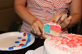 6. Now you're left with the whole blue cake and the thin top layers of the red and white cakes. Stack the thin red layer on top of the thin white layer.  Using a bowl as your guide, cut a circle in the middle of both your blue and red/white cakes.