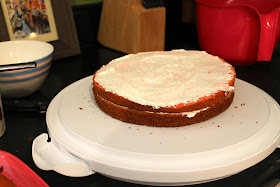 5. Remove the bottom two layers of the white and red cakes and stack on a separate plate with icing in the middle and on top.
