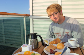We ordered room service for breakfast one morning to eat out on our balcony. This is husband's "I'm sitting outside in 45 degree weather eating breakfast to make my wife happy" face.