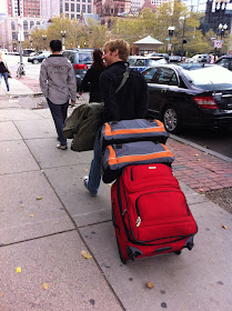 I am thankful for my wonderful husband who helps me so much. He cleans bathrooms, unloads the dishwasher, folds laundry, does the yard work... and carries my luggage through the streets of Boston.