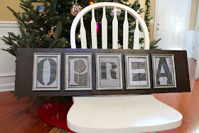 Once the wood is dry (also about 2 hours to be safe). Hot glue the assembled frames to the wood. This step was actually the most tedious for me, because of my OCD-ness. I used a tape measure and a level to make sure the letters were evenly spaced and centered. Here is the finished product. This would make a great gift for anyone or decoration for your own wall.