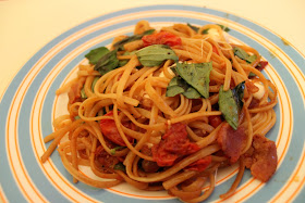 So I was originally going to make just caprese pasta, but when I opened the refrigerator- the bacon was staring me in the face just begging to be eaten. I love bacon, I really do, but I tossed it in the pasta with a bit of uncertainty. Let me tell you, I am so glad I did. It was oh. so. yummy.