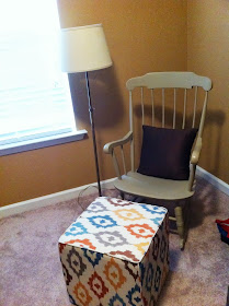 Last but not least, our first nursery item came in the mail yesterday. A pouf ottoman from Walmart. Yes, you read that right. These bad boys that are all the rage on Pinterest these days can cost you a pretty penny from various retailers (I'm talking $500 or more), but Walmart has a decent selection ranging in price from $30-$100.  I'm sorry, but unless it's made by leprechauns and filled with gold, it's not worth spending that much for something to put your feet on while rocking a screaming baby. The one we got was $30 and it really is larger than I thought it'd be and seems to be pretty good quality. So here is your first peek into what will be baby O's room. We haven't painted the walls yet, but that is next on this list...