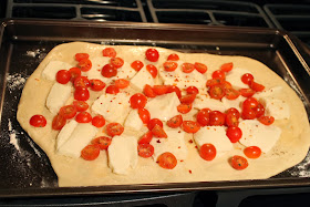 3. Spread sliced mozzarella and tomatoes evenly across the pizza.