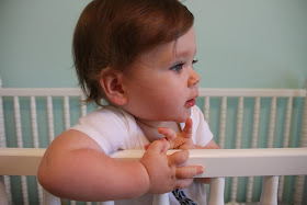 Some of your favorite toys right now were gifts you got for your birthday. You love playing with your Little People pirate ship that was a gift from mommy and daddy. You also love your Noah's ark set from Oma and Opa along with some really cute wind up cars from Addie. You play with pretty much anything that is in front of you, but those are the ones you typically crawl to first thing. You have fully discovered the stairs and can mange to climb your way to the top in no time (with mommy and daddy close behind spotting).