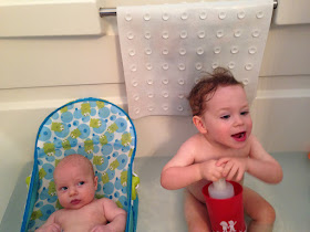 We don't go to the doctor until next week, so I'll post your stats then. My guess would be that you're well over 14 lbs and quite a bit longer. You're still fitting in 3 month clothes, but they're getting pretty snug and I feel like we'll be in 6 month in a couple weeks. You're still in size two diapers. You've started laughing regularly and we'll do just about anything to make you laugh! You are still sleeping like a champ. You sleep 12 hours at night and are more than ready for bed by 6:45 PM. In typical second child fashion, your morning nap is less than consistent as we're usually on the go somewhere. You catch up during afternoon nap by sleeping 3 hours like your brother! You love to eat and have been eating every three to four hours. We are so blessed to be your mommy and daddy and love you to pieces, sweet boy!