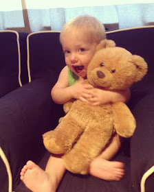 You're still our tiny little peanut at just over 19lbs (10th %) and 30.75" (25th %), but your personality makes up for your size. You love wrestling and when daddy throws you up in the air. You love dancing, bouncing and doing your signature dance move- the shoulder shimmy.