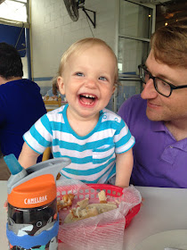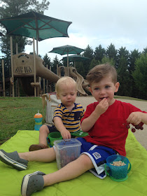 We try to eat outdoor as much as possible, because it makes for less food to clean off of our floors and walls. Finn's a huge fan. Ryder's undecided.