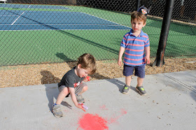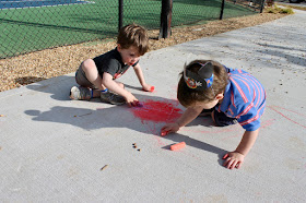 I love how this pic sums up their little friendship so much. Finn is just all in covered in chalk from head to toe. Ryan has a little bit of chalk on his fingers and is a little unsure about what Finn is doing.