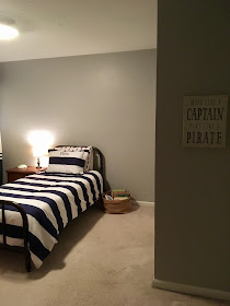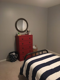 His dresser was given to us when my parents moved from their house. I chalk painted it red and spray painted the knobs. Finn wanted his walls painted red, but settled for the dresser. This cute mirror was a $10 yard sale find. There is still a lot more I'd like to add, but we also have a whole house to fill. If you also knew Finn, you'd know that it's good we're giving him a little bit at a time. Not sure what the end result would be with a chair, book shelf, etc. added to his room right away. There's a reason he's been in his crib until almost 4. He is just as happy as he can be with his new room, though, and he knows his crib will be the baby's new bed. We've thankfully had zero issues with switching to the big boy bed- probably because he was three and a half- but still, he loves to sleep in it and knows that we'll get him when his clock lights up green. We are still not night-trained yet for potty training, so he knows he's not allowed to get out of bed and so far it's been going really well.