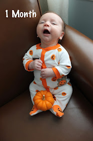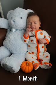 You may be the youngest, but you are certainly not our littlest. You're up to size 1 diapers and 3 mo clothing. At your 1 month appointment, you were up to 10lbs 15oz and 23in. This is probably average, but considering your brothers are such peanuts it feels big to us.