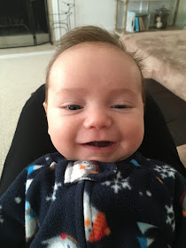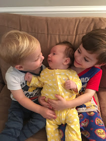 You are definitely more aware of what's going on around you. You hear your big brothers all day long and turn your head to see what they're doing. You've started smiling and will give us the biggest, gummiest smiles when we're talking to you.