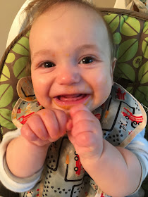 You love to eat! You get three 6oz bottles/day and an 8oz bottle at bedtime. You love purees at breakfast and dinner and lunch on days when it's actually convenient for me to sit down and feed it to you. You started eating baby yogurt this month and love it.