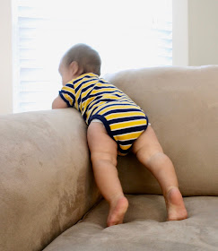 You know how to sit up on your own and it's just the cutest, because you sort of back into it from being on your belly. You just figured out how to pull up on furniture and stand up and are so proud when you do. You're still doing what we call the "wounded turtle" crawl on your belly, but have just figured out how to rock backwards and forwards on your hands and knees.
